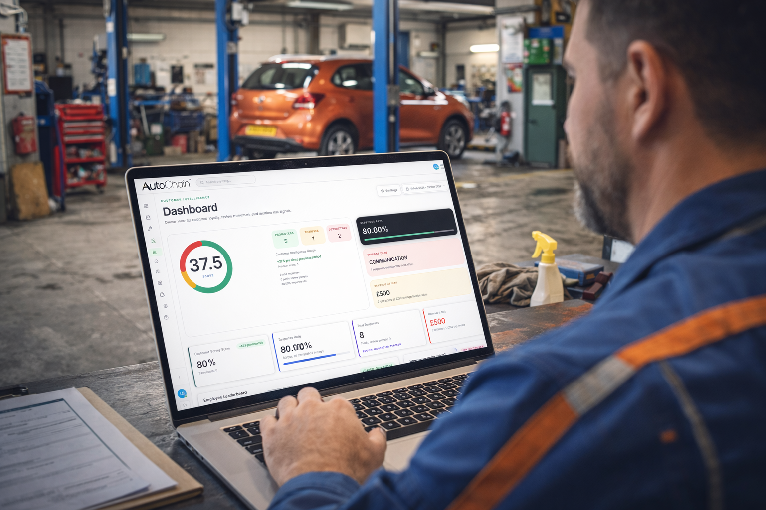 Understand which customers are loyal, who is drifting away, where communication is breaking down, and which unresolved work is costing you revenue. One clean dashboard, built for UK workshops.